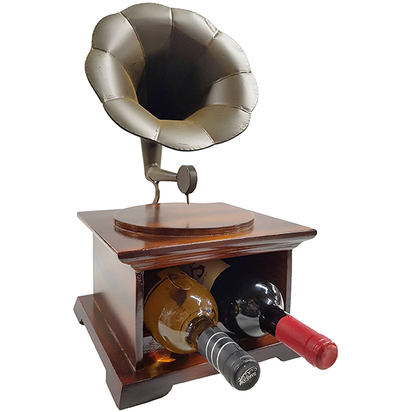 בר יין עץ בצורת גרמופון ל- 2 בקבוקים